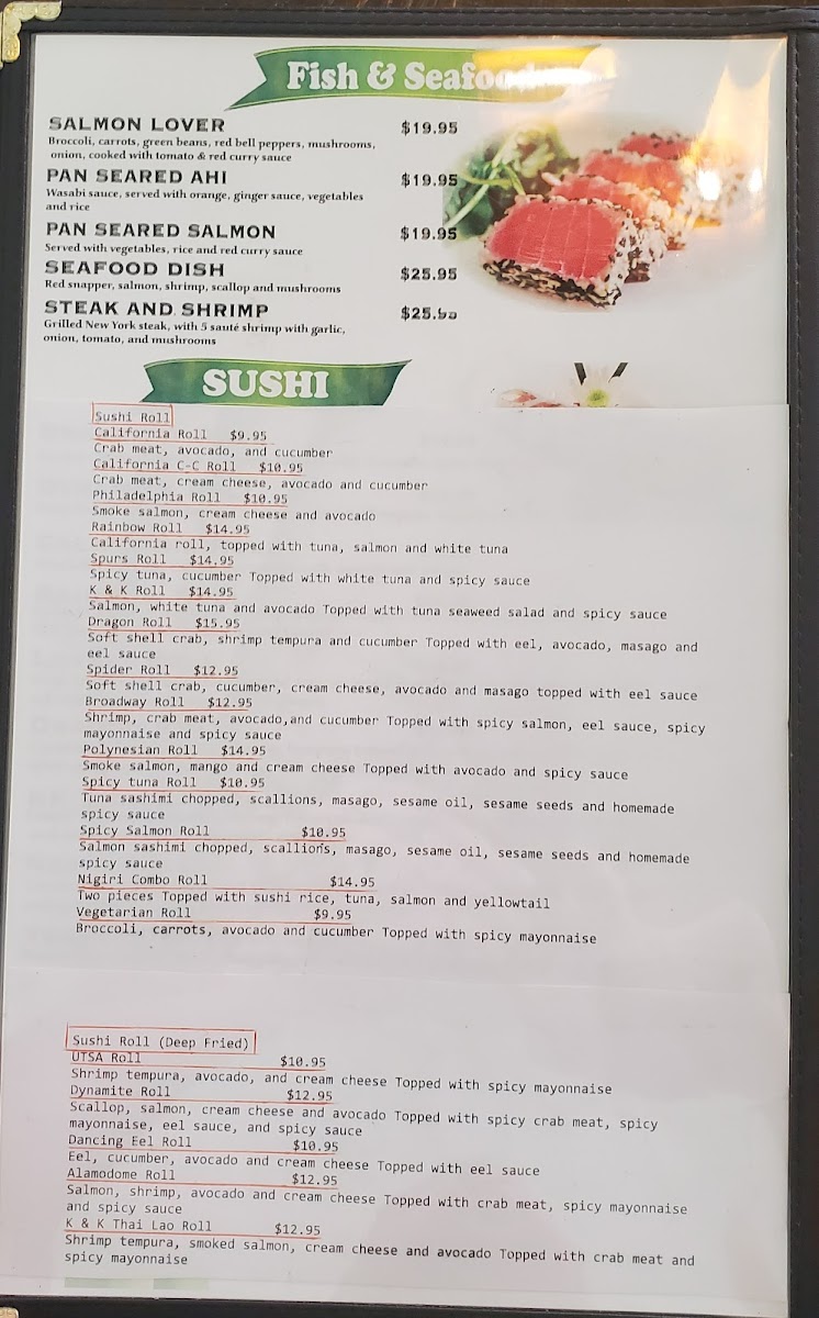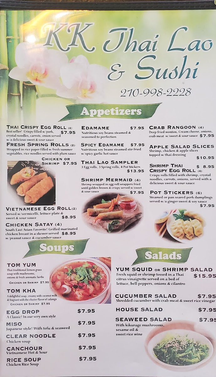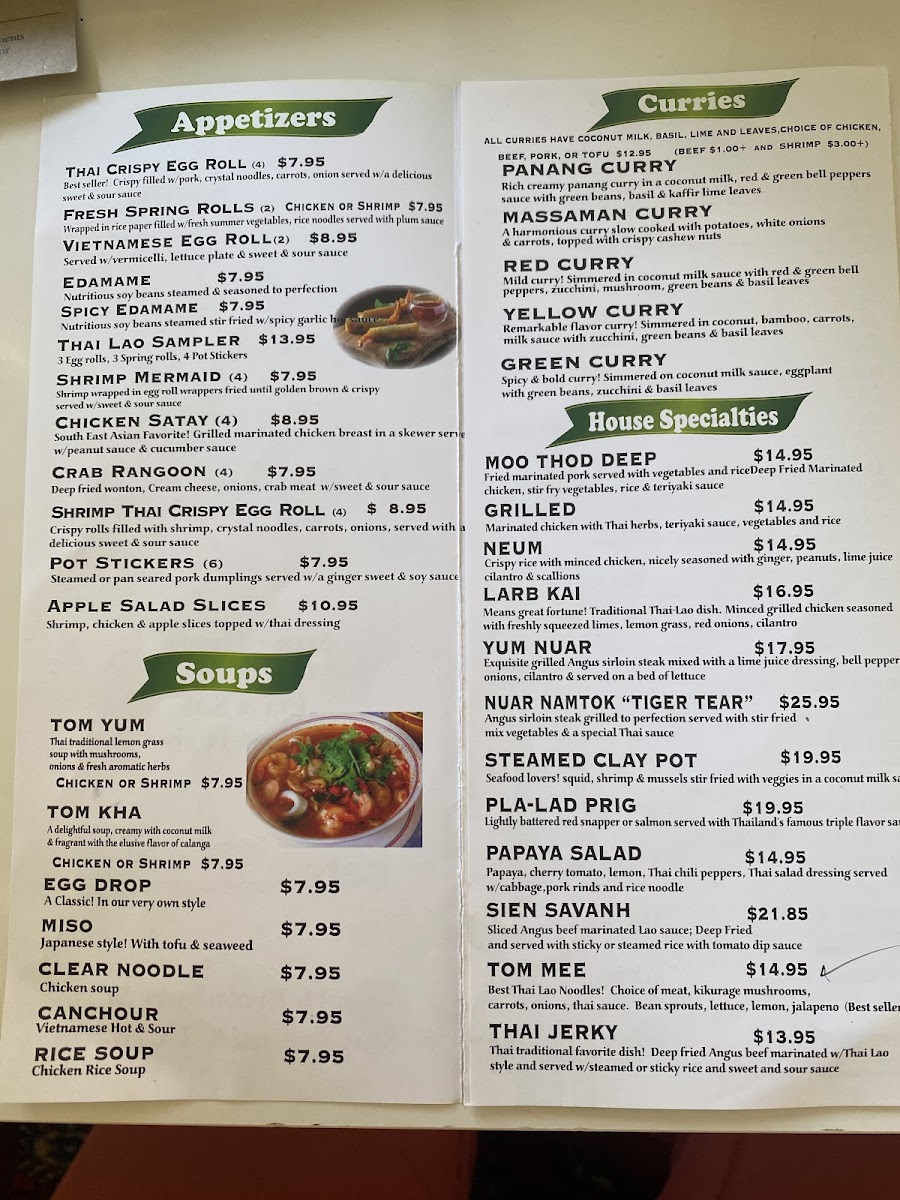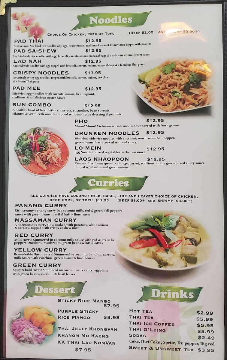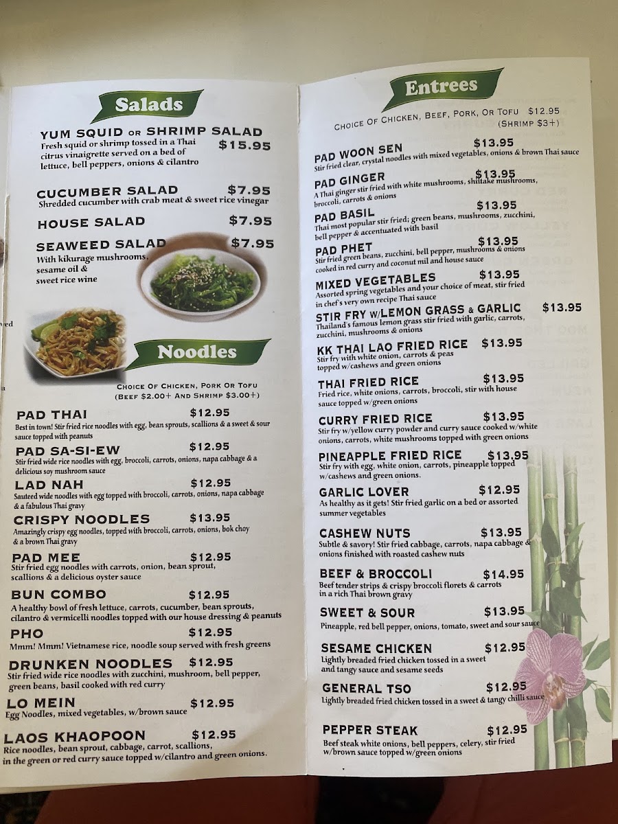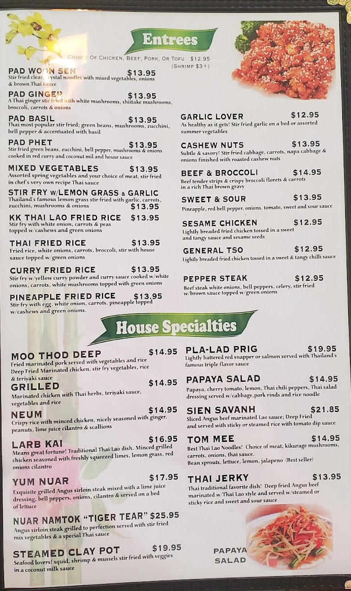 Overall, the menu at Thai Lao Orchid Restaurant combines traditional Thai and Lao flavors with modern cooking techniques, offering a variety of options that cater to different tastes and dietary preferences. Whether you're in the mood for something light like the fresh spring rolls or a hearty, flavorful curry, the dishes here promise an authentic and satisfying experience.